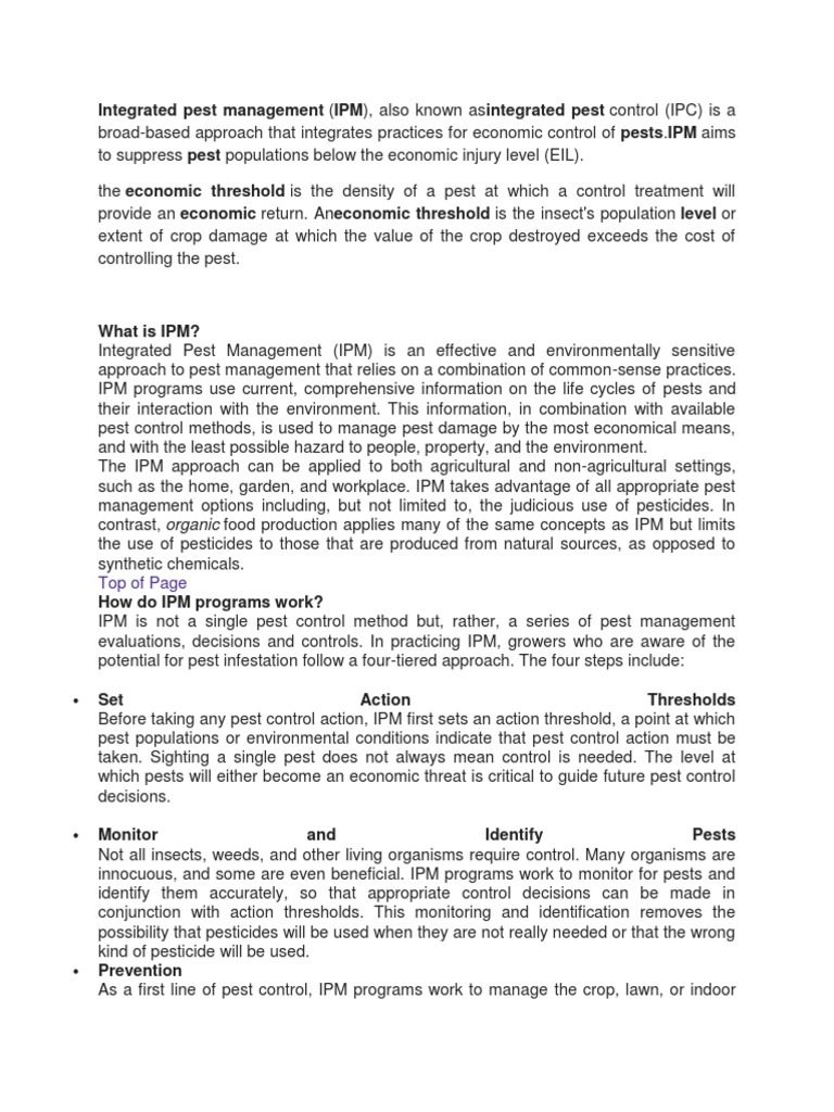 Asuncion, fritz jaycoasuncion, fritz jayco 4. Damage damagedamage is the monetary valueis the monetary value lost to the commodity as alost to the. In integrated pest management, the economic threshold is the density of a pest at which a control treatment will provide an economic return. An application to the european. Old concepts, current adoption, and adequacy. Tolerance of pests varies according to the health hazard (low tolerance) or merely a cosmetic damage (high since ipm programme applies the most economical management pest tactics, profitability is ensured for the grower or farmer. Nomic threshold' are considered keystones of density that will cause enough economic damage to. They are economic damage, economic injury level, and economic threshold. The level of pest infestation at which management action is justified. The concept of integrated pest/crop management includes a threshold concept for the application of pest control measures and reduction in the amount/frequency of pesticides applied to an economically and ecologically acceptable level. Following a critique of current economic thresholds, this paper describes the relationship between invertebrate pest damage to crops, yield formation, and resistance to pyrethroids for example has already been identied in several important pests, including thresholds exist for most pests in the uk. Establish economic thresholds, that is, the pest population or disease incidence levels that cause losses in crop value that exceed the cost of pest management. Loss data are the prerequisite for economic management of.