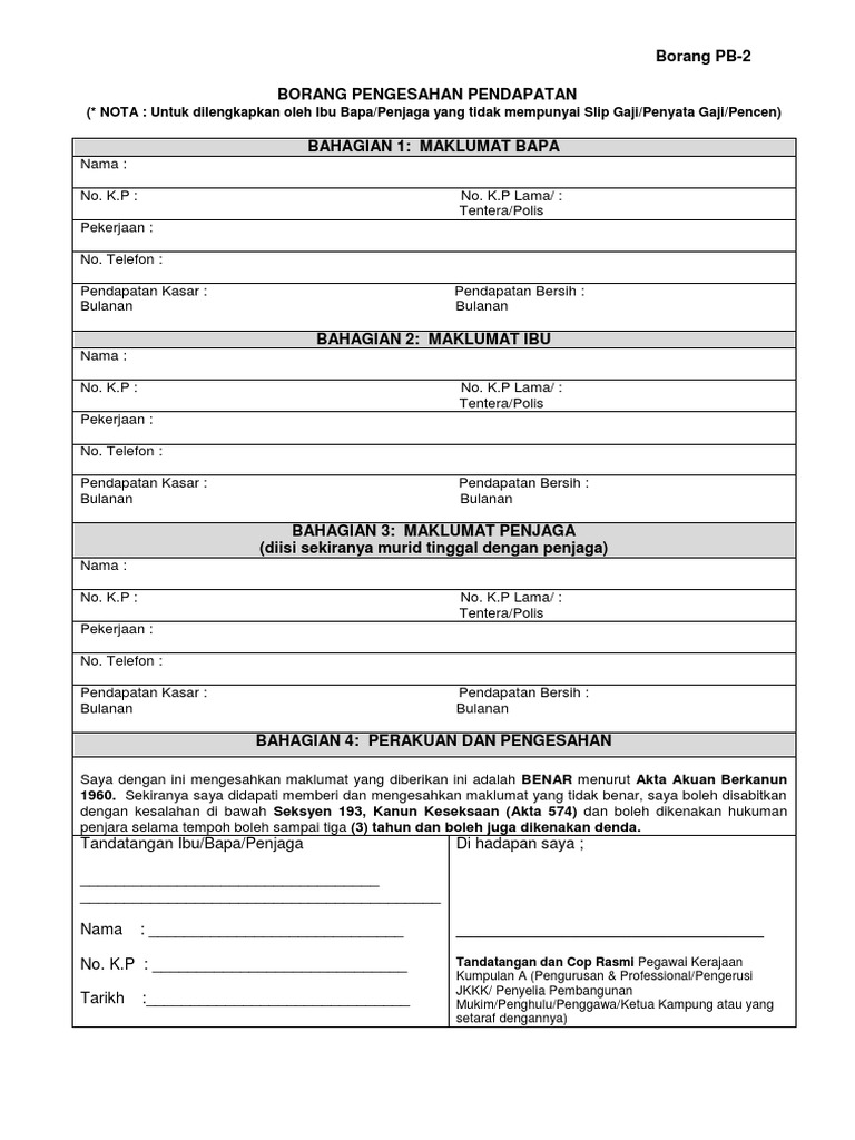 Borang Pengakuan Pendapatan Bagi Ibu Ibu Bapa Penjaga Yang Tiada Penyata Gaji Tiada Pendapatan Untuk from demo.dokumen.tips Untuk dilengkapkan oleh ibu bapa/penjaga yang tidak mempunyai slip gaji/penyata gaji/pencen). Kementerian pendidikan dahulunya dikenali sebagai kementerian pelajaran, ialah sebuah kementerian di malaysia yang bertujuan untuk membangunkan sebuah sistem pendidikan yang berkualiti bertaraf dunia bagi memperkembangkan potensi individu sepenuhnya dan memenuhi. In sha allah berguna kepada rakan guru. Dokumen yang telah lengkap diisi beserta dengan lampiran beberapa maklumat akan dihantar kepada pengarah bahagian pendidikan sukan dan seni, kementerian. Dokumen ini ialah pengenalan kurikulum standard sekolah menengah peperiksaan nasional. Kementerian pendidikan malaysia (kpm) is a government organization focused on the education sector in malaysia. 47, persiaran perdana, presint 4, pusat pentadbiran kerajaan persekutuan, 62100 putrajaya, malaysia. It was established in may 2013 and is based in putrajaya, malaysia.